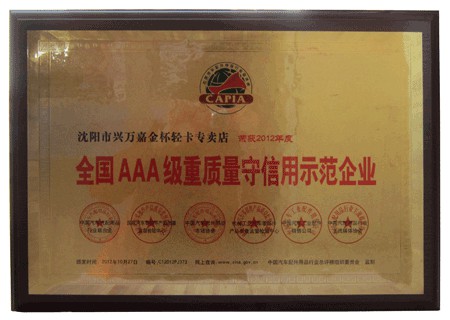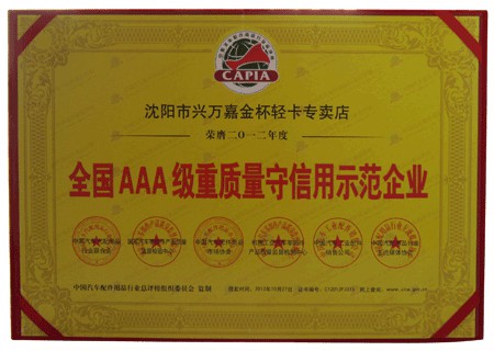 证书编号: C12012PJ373 证书名称: 全国AAA级重质量守信用示范企业 发证机构: 中国汽车配件用品行业总评榜组织委员会 生效日期: 2012年10月27日 截止日期: 2013年10月27日 认证简介: 沈阳兴万嘉金杯轻卡专卖店在2012年度的汽配会上荣获了“全国AAA级重质量守信用示范企业”,本次评选是由中国汽车汽配用品行业联合会、国家汽车零部件产品质量监督检验中心、中国汽车配件用品市场协会、机械工业汽车零部件产品质量监督检测中心、中国汽车工业配件销售公司、中国汽配用品行业主流媒体协会颁发。